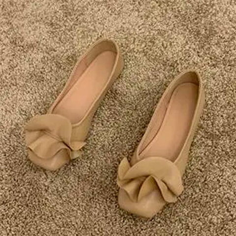 フリルとスクエアトゥがかわいいポイント!ヒールがなくて安全だからお子様の自転車送迎も安心!柔らかい合皮素材使用したので、優しい肌触り。