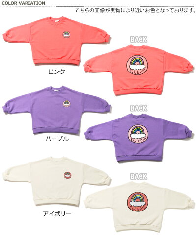 ●虹プリントがアクセントになった、後ろ姿もおしゃれなキッズ用スウェット ドロップショルダーデザインがこなれ感をプラス ワイドなシルエットが窮屈感なく一日中快適な着心地 お袖、裾、首元はしっかりとしたリブでよれにくいのも魅力 柔らかい手触りの綿100%を使ったスウェット生地×優しい肌触りのミニ裏毛 他にはない目を惹くプリントとカラーリングが周りと差をつけてくれる一枚■着用モデル:身長120cm/Mサイズ着用■生産:韓国製 素材 コットン100% 生地感 程よい厚みの柔らかいスウェット生地【伸縮性】あり 【透け感】なし(アイボリーややあり) 【裏地】なし カラー ピンク(ほんのりオレンジを含んだ明るいピンク)パープル(やや白を含んだやや薄めの紫)アイボリー(黄みがかった白) サイズ(cm) ゆき丈 身幅 着丈 重さ(g) S(100cm〜108cm) 43 40 37 186 M(109cm〜117cm) 50 42 40.5 220 L(118cm〜126cm) 54 44 44 242 上記サイズ表はスタッフが採寸し、製品の実寸を掲載しております。